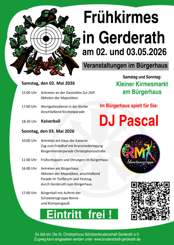 Antreten 15:00 Uhr bei „Zur Zöff“; Übergang Lauerstr.; Friedhofstr.; Genenderstr.; Christophorusstr., Abholung Bambiniprinzessin; Christophorusstr.; St.-James-Str.; Schulstr.; Übergang Lauerstr.; Vossemer Str.; Am Heiderfeld; Pappelhof, Abholung Schülerprinz; Pappelhof; Am Heiderfeld; Vossemer Str.; Am Bildchen; Weidbruchsweg; Übergang Lauerstr.; Friedhofstr.; Genenderstr., Abholung Prinzessin; Genenderstr.; Im Torfbruch; Am Floßbach; Abholung Kaiserin; Am Floßbach; Im Torfbruch; Genenderstr.; Kirche Gerderath, 17:00 Uhr Wortgottesdienst.